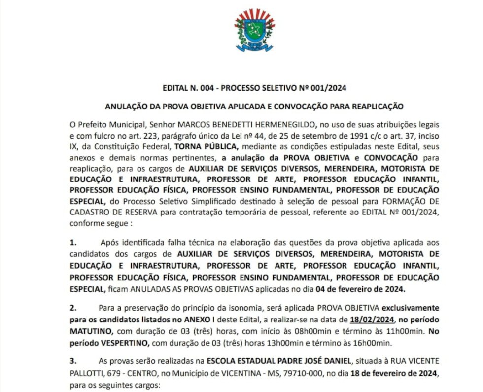Prova do processo seletivo da prefeitura de Vicentina será reaplicada; veja quais cargos e a lista dos candidatos