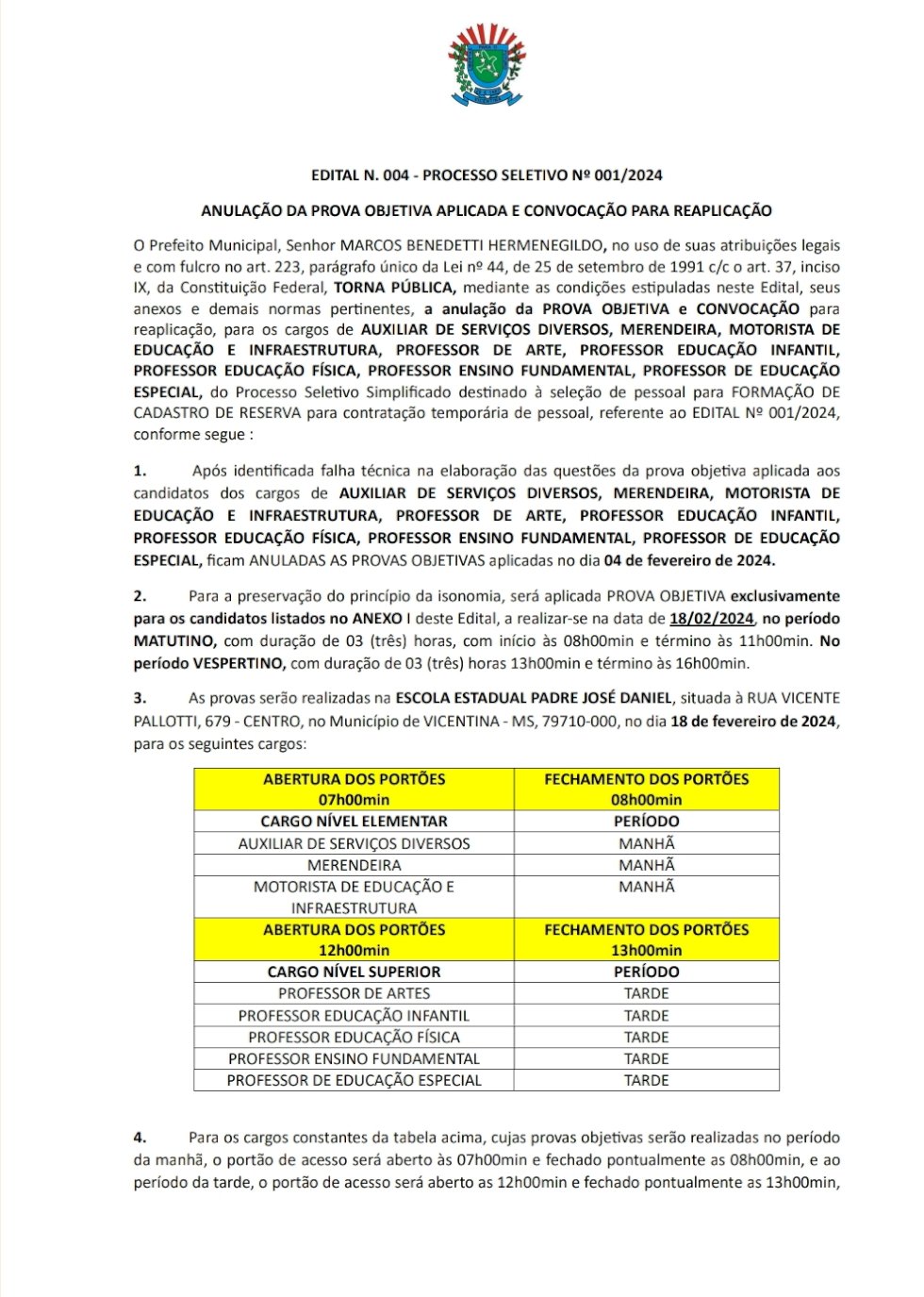 ESPECIAL, ficam ANULADAS AS PROVAS OBJETIVAS aplicadas no dia 04 de fevereiro de 2024.