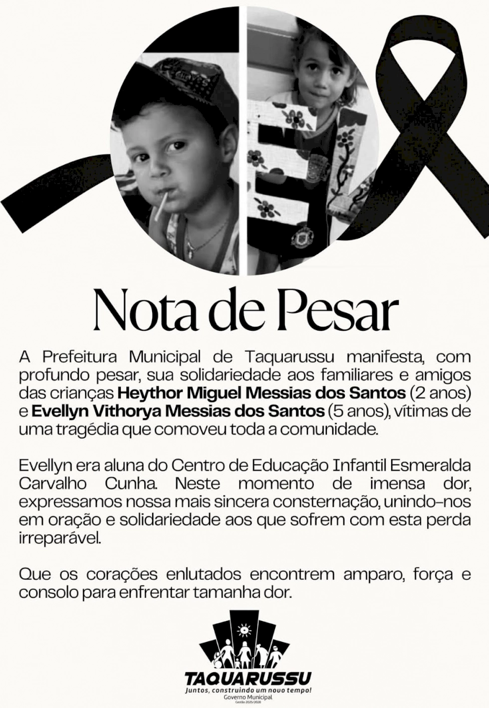 A Prefeitura Municipal de Taquarussu — a 310 quilômetros de Campo Grande — emitiu uma nota de pesar pelo falecimento de Heythor Miguel Messias dos Santos e Evellyn Vithorya Messias dos Santos, de 2 e 5 anos, respectivamente, em um acidente ocorrido na cidade, na noite desta quinta-feira (3).