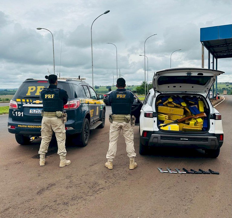 No veículo foram encontrados 1.010 quilos de maconha, uma espingarda de pressão com munições, além de sete réplicas de pistolas. O automóvel utilizava placas falsas e possuía registro de roubo/furto, desde setembro de 2025, em São Paulo.