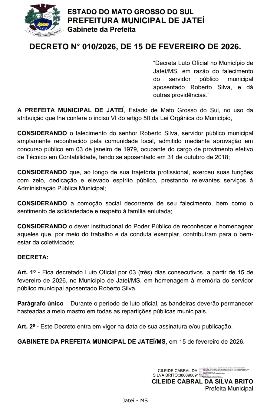 A prefeita Cileide Cabral da Silva Brito anunciou luto oficial em homenagem a história, trajetória e a contribuição de Roberto Silva “Amaral” ao município de Jateí.