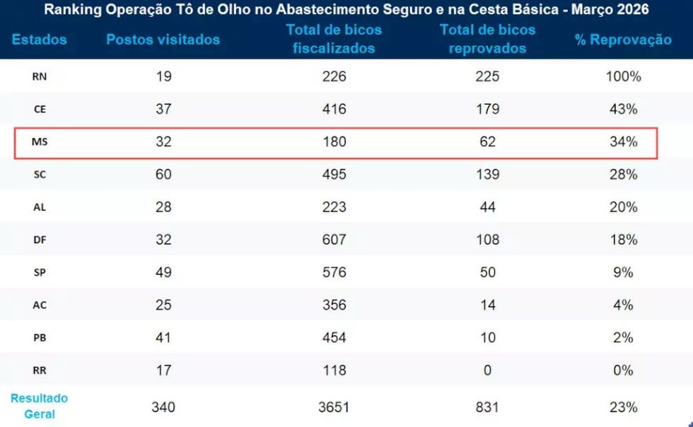Operação nacional de fiscalização identificou que 1 a cada 3 bicos de combustíveis fiscalizados em Mato Grosso do Sul foi reprovado. A ação fez parte da operação “Tô de Olho no Abastecimento Seguro e na Medida Certa', realizada entre os dias 10 e 12 de março, e coordenada pelo MDIC (Ministério do Desenvolvimento, Indústria, Comércio e Serviços).