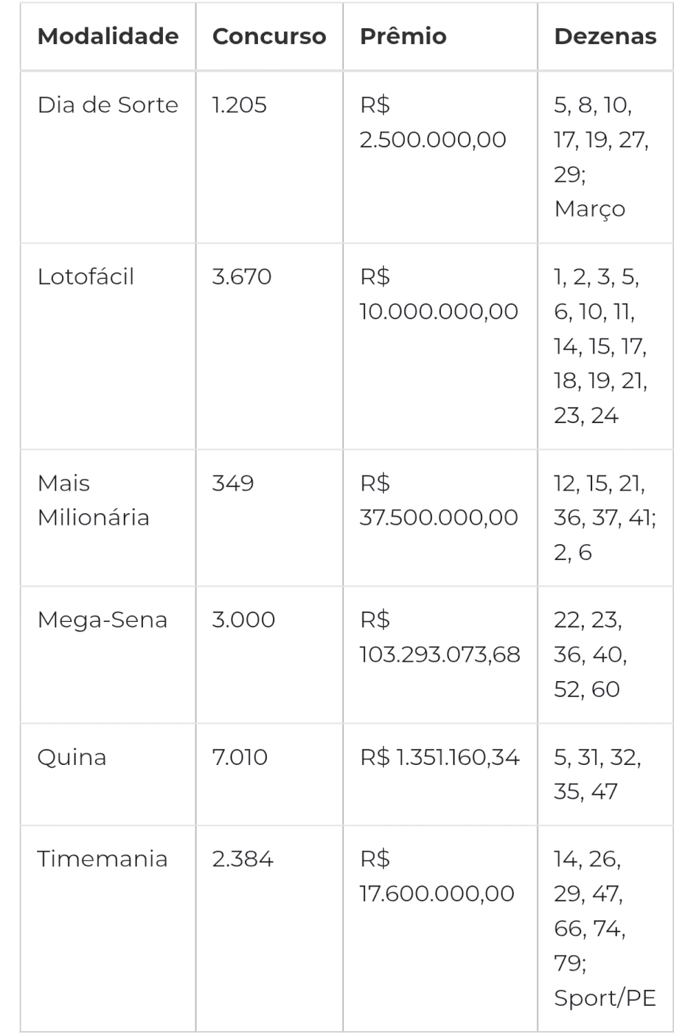 Conforme a Caixa Econômica Federal, os números sorteados foram: 22, 23, 36, 40, 52 e 60.
